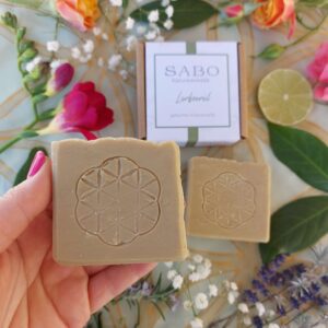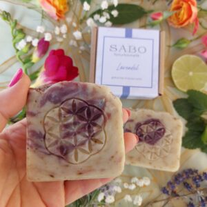 Jede meiner Seifen trägt ein einzigartiges Zeichen, das aus einer Mischung der Blume des Lebens und des Kerns des Lebens besteht, die von Blütenblättern begrenzt wird.